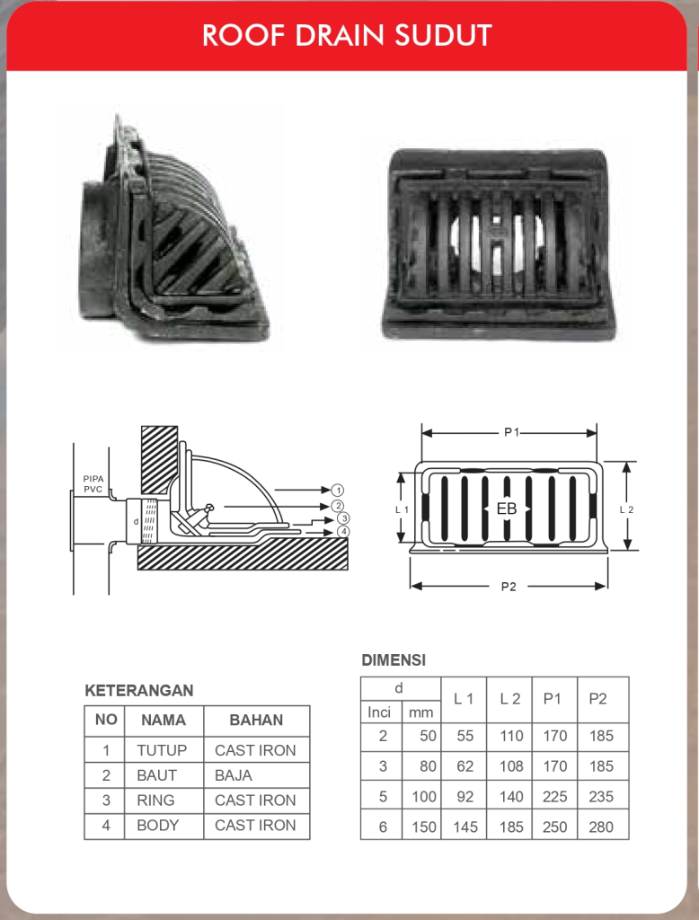 This product made from cast iron material with two option cover, that’s convex cover (tutup cembung) and flat cover (tutup datar). this product have 2 part that’s body and cover, that’s the different with Roof Drain 3 Susun (3 Stack). This product used for drainage at your roof, your balcony or at your roof top building