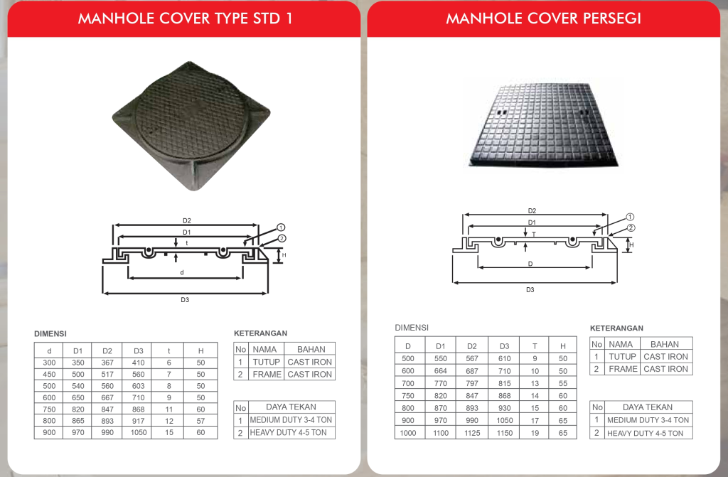 Our manhole product made from Cast iron material that have two type class for holding pressure power, that’s Medium Duty about 3 – 4 ton pressure and Heavy Duty about 4 – 5 ton pressure.